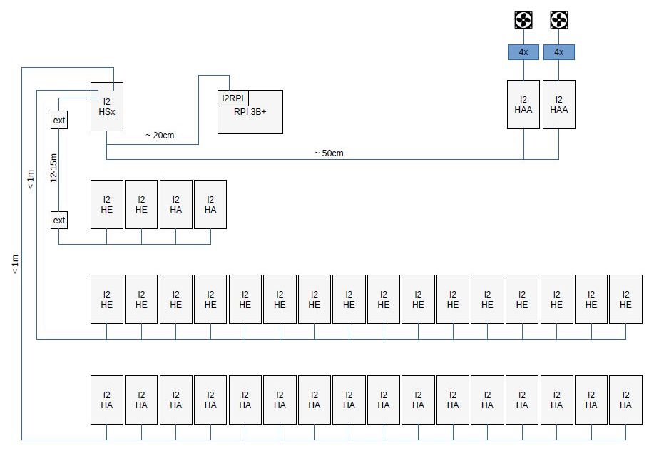 Die Außenposten sind aktuell über einen I²C-Extender angebunden. Die Leitungslängen betragen etwa 12 bis 15 Meter. Ein Leitungstreiber für größere Distanzen ist bereits vorhanden, aber noch nicht im Einsatz.